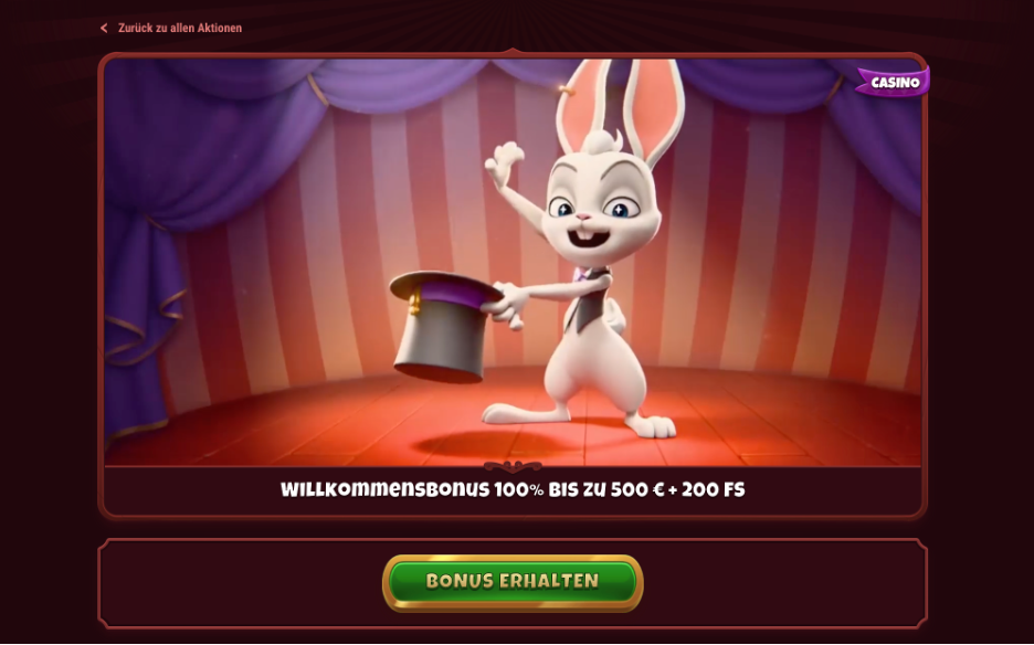 Registrieren Sie sich, gehen Sie zum Abschnitt „Kasse” oder „Aktionen”, wählen Sie das gewünschte Angebot aus und tätigen Sie eine Einzahlung unter Berücksichtigung der Umsatzbedingungen. Nehmen Sie mit Magius an den lukrativsten Aktionen des Online-Casinos teil!