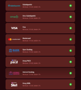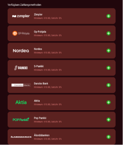 - E-Wallets: Zimpler, Nordea, Aktia.