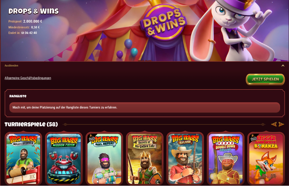 „Grand Marathon Magius” – DROPS & Wins: Monatlicher Wettbewerb mit einem Preispool von 2.000.000 Euro! Die ersten 100 Plätze erhalten Preise. Um teilzunehmen, müssen Sie BIG BASS-Slots spielen.